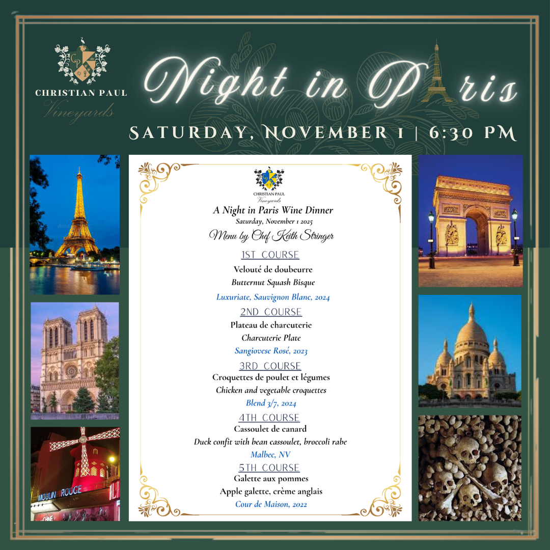 Saturday, November 1st - 6:30pm - Fall Wine Dinner, A Night in Paris