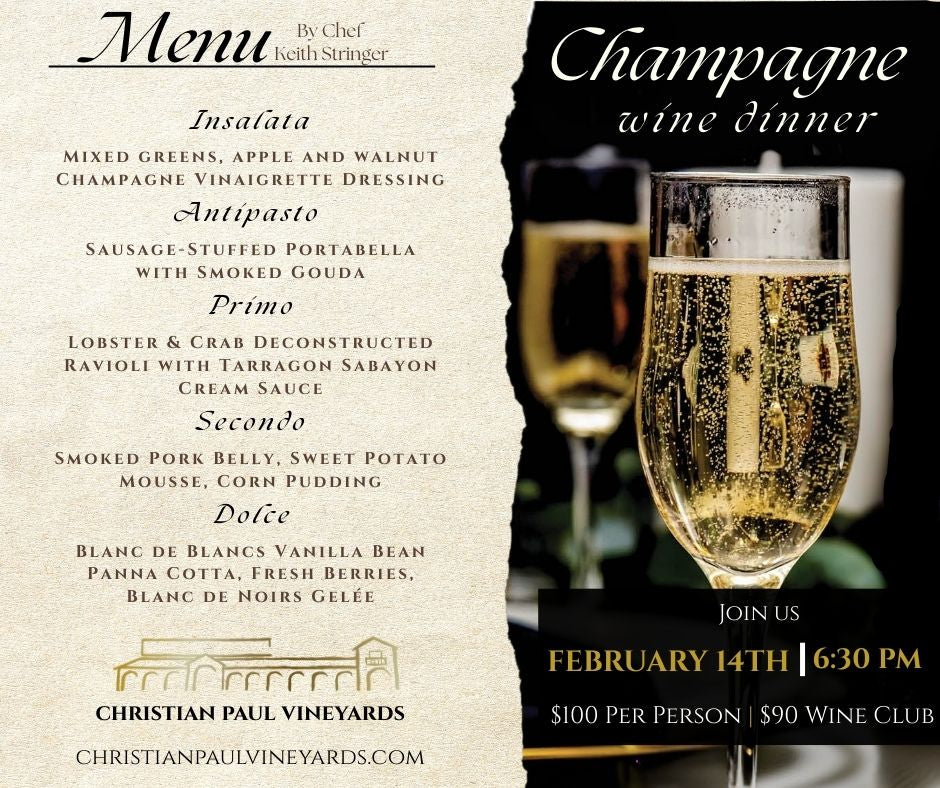 Celebrate Valentine’s Day at Christian Paul Vineyards with a loved one—or treat yourself to something sweet. Join us in the tasting room on Saturday, February 14th, beginning at 1:00 PM, for a truly indulgent experience.