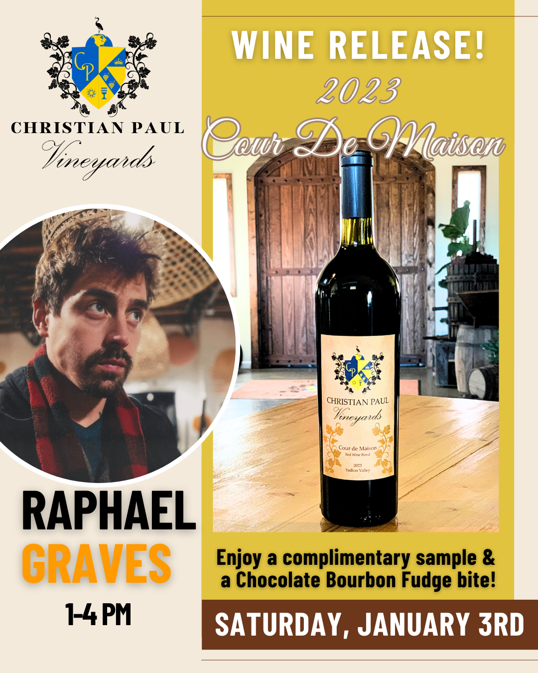 Kick off the New Year with an afternoon of live music and a new wine at Christian Paul Vineyards. We are excited to release our 2023 Cour de Maison, Bordeaux-style red blend to you! This lush full-bodied red will not disappoint. Come for a complimentary tasting paired with a Chocolate Bourbon fudge bite.