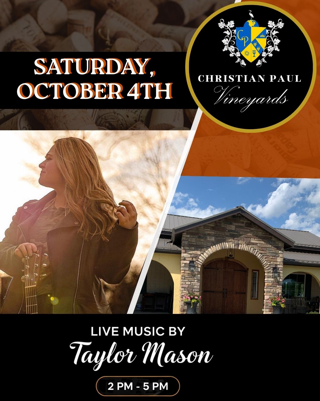 Get ready for a great afternoon at the Christian Paul tasting room! We’re turning up the energy on Saturday, October 4th with live music by Taylor Mason from 2 to 5 PM on the patio.