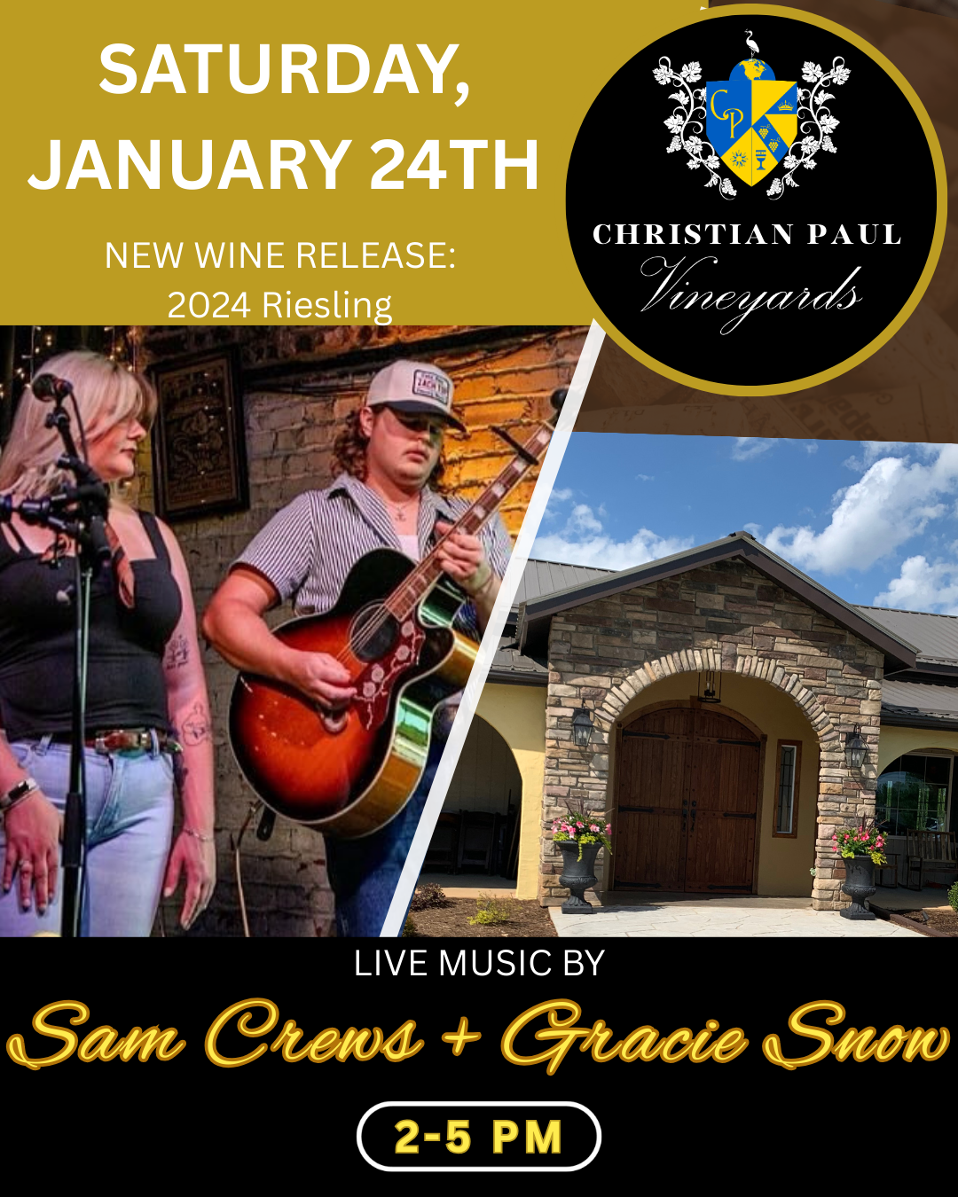 Join us Saturday, January 24th for live music featuring Gracie Snow and Sam Crews from 2–5 PM. We are sweetening the deal with the release of our 2024 Riesling and pairing it with a goat cheese and fig crostini. Come for a complimentary pour and small bite, while enjoying live music by the talented Gracie and Sam.