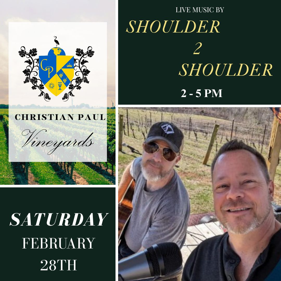Live music returns to Christian Paul Vineyards on Saturday, February 28th, with Shoulder to Shoulder taking the stage from 2:00–5:00 PM.