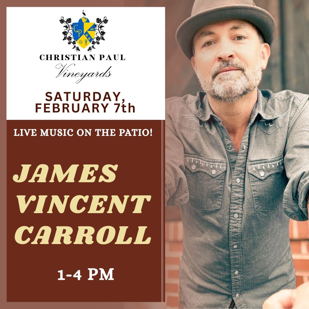 Get ready for an afternoon of great music, great wine, and great vibes at Christian Paul Vineyards! Join us on Saturday, February 7th, as local fan favorite James Vincent Carroll returns to the tasting room for a live performance from 1:00–4:00 PM.