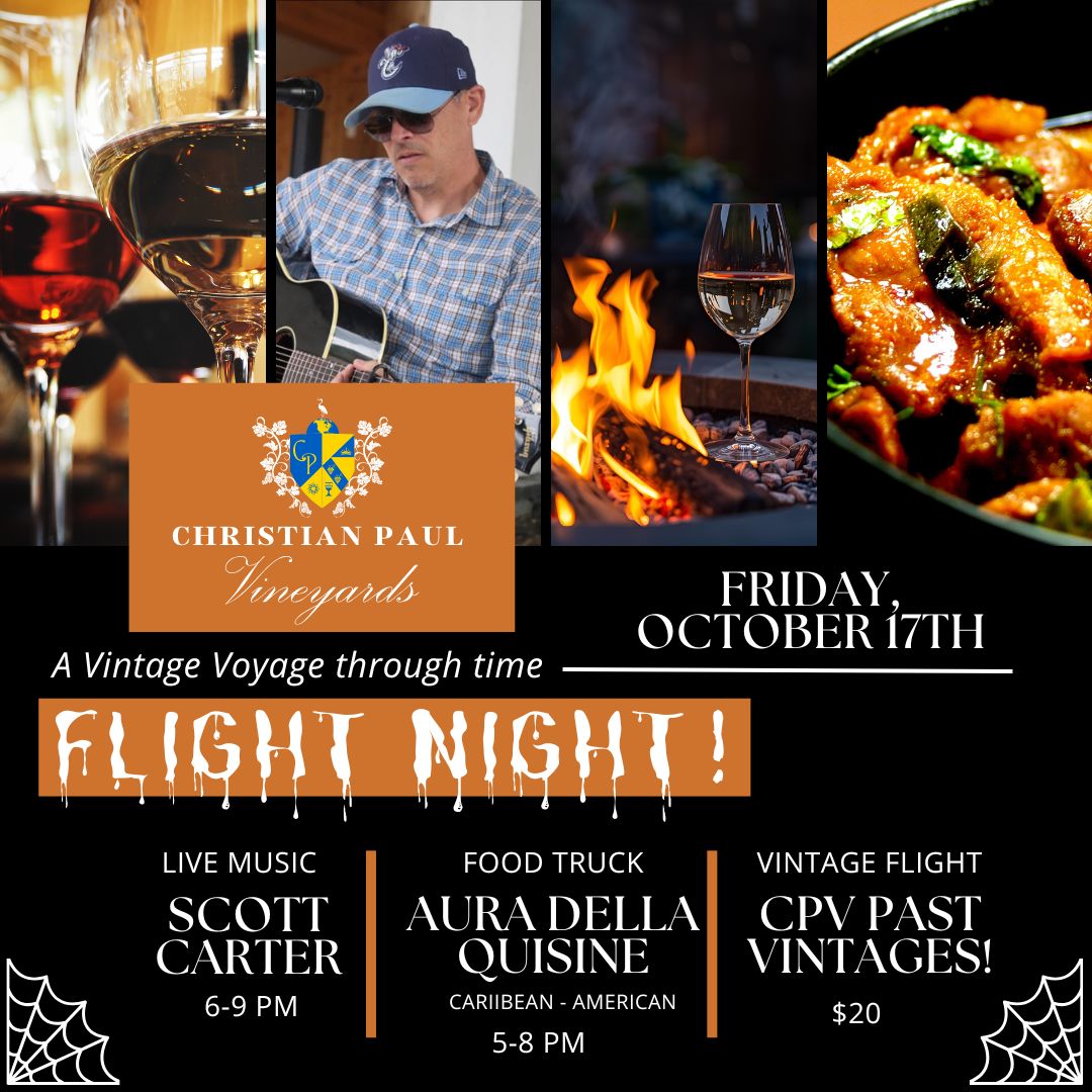 Join us for Flight Night at the Vineyard! Experience an enchanting fall evening where wine, music, and seasonal flair come together at Christian Paul Vineyards. This special event features a curated wine flight of four hand-selected vintages from the ghosts of our library’s past, offering a rare opportunity to taste and explore the character of our aged wines in one unique experience. Aura Dell Quisine, a Caribbean-American food truck will be on-site from 5-8 pm bringing the perfect fusion of island heat to complement vineyard comfort. Live music on the patio by Scott Carter from 6-9 pm will set the mood as the sun sets over the vines, with the patio aglow in string lights and the warmth of our fire pit. No tickets or reservations required. Wine flights will be available for $20 at the tasting bar, so come early and enjoy a perfect October evening.